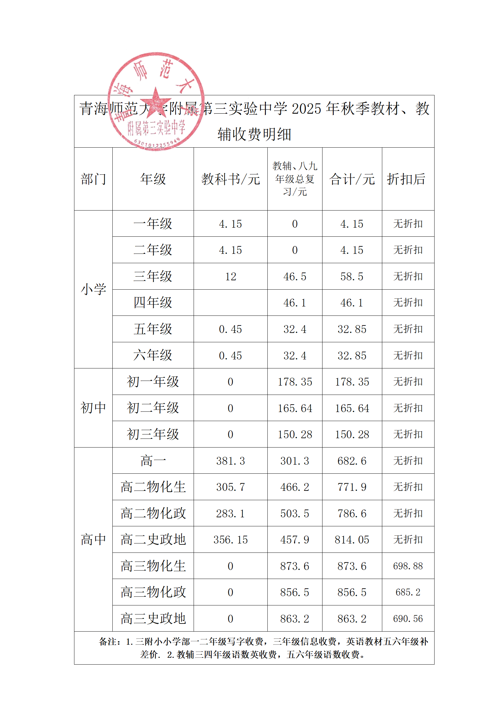 青海师范大学附属第三实验中学2025年秋季教材、教辅收费明细公示(查看附件)