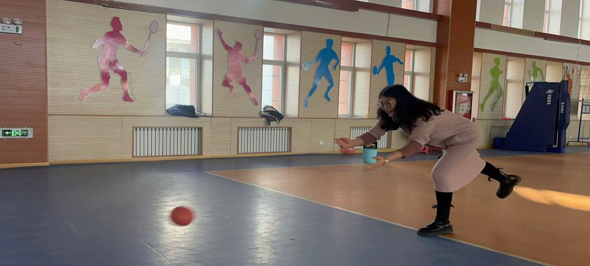 “简易保龄球”:用实心球击倒前方排列的矿泉水瓶(充当球瓶)。滚球声、瓶子倒地声、欢呼声交织在一起。老师们认真研究“球路”,或一击全中,赢得满堂彩;或擦边而过,引发阵阵惋惜与善意的笑声,紧张又充满趣味。